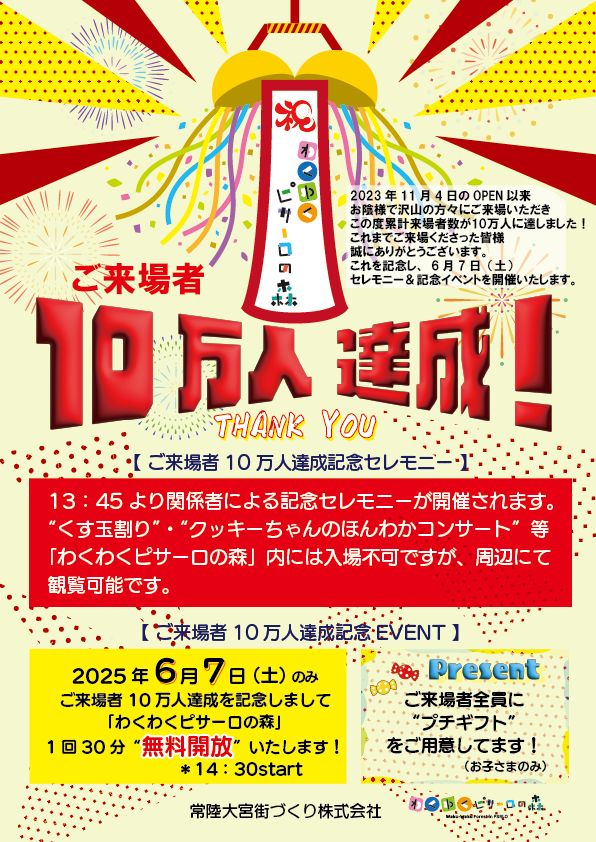屋内こどもの遊び場「わくわくピサーロの森」ご来場者10万人達成記念!